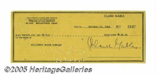<B>Clark Gable Signed Check.</B></I> Personal check dated October 10, 1946 and signed by leading man Clark Gable in black ink. In very good condition, with staple holes to the top left corner, a vertical fold crease, and the usual cancellation holes and stamps. <I>With COA from PSA/DNA.</B></I>