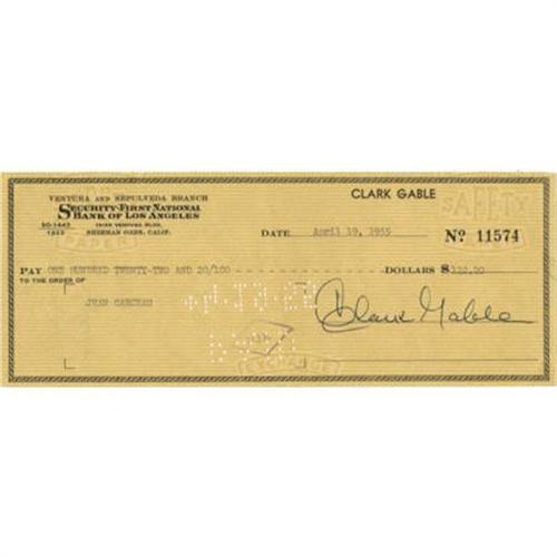 <B>Clark Gable Signed Check.</B></I> A personal check for $122.20, dated April 19, 1955 and signed by the Hollywood legend in black ink. In Very Fine to Excellent condition with the usual bank cancellation marks. The signature is big and bold. <I>Accompanied by a COA from PSA/DNA.</B></I><BR><BR><b>Shipping:</b> Flat Material, Small (<a target="_blank" href="http://www.heritageauctions.com/common/shipping.php">view shipping information</a>)