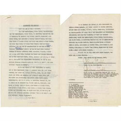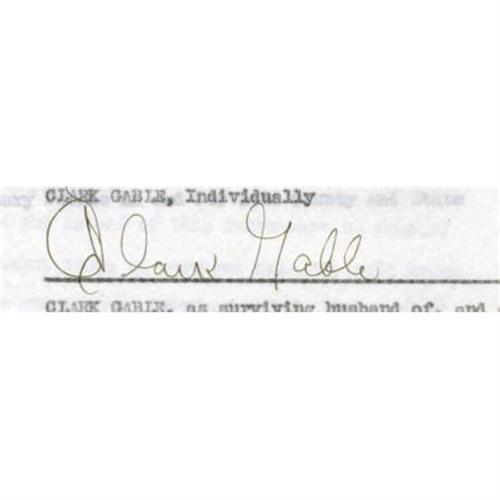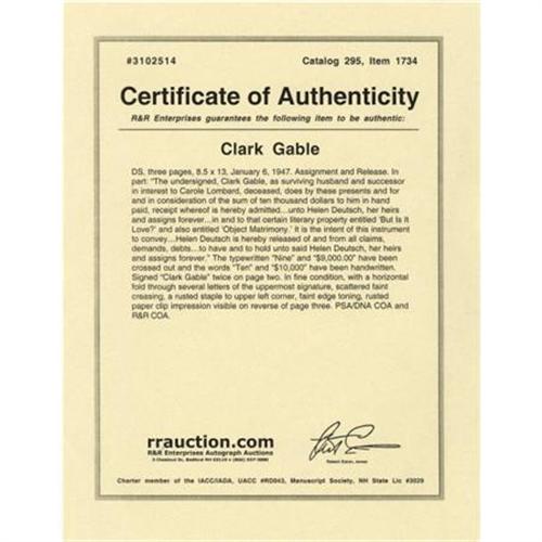 <B>Clark Gable Signed Document.</B></I> A three-page Assignment and Release document dated January 6, 1947, signed twice by Gable on page two in black ink. It reads in part: "The undersigned, Clark Gable, as surviving husband and successor in interest to Carole Lombard, deceased, does by these presents and for and in consideration of the sum of ten thousand dollars to him in hand paid, receipt whereof is hereby admitted...unto Helen Deutsch, her heirs and assigns forever... in and to that certain literary property entitled 'But Is It Love?' and also entitled 'Object Matrimony.' " In Fine to Very Fine condition with a horizontal fold through several letters of the topmost signature, some mild creasing, rusted staple to the upper left corner, mild edge toning, and a rusted paperclip indentation. <I>Accompanied by a COA from PSA/DNA.</B></I> <I>Accompanied by LOA from PSA/DNA.</B></I><BR><BR><b>Shipping:</b> Flat Material, Small (<a target="_blank" href="http://www.heritageauctions.com/common/shipping.php">view shipping information</a>)
