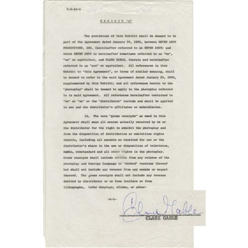 <B>Clark Gable Signed "The Misfits" Contract.</B></I> A 17-page employment agreement dated January 30, 1960, engaging Clark Gable to render services as an actor for <I>The Misfits,</B></I> signed by him on the last page in blue ink. The movie would prove to be Gable's last, as he died after suffering a massive heart attack two weeks after filming wrapped. The document is in overall Very Fine condition with mild tanning and wear, and the usual staple and binder holes tot he top edge.<I>Accompanied by LOA from PSA/DNA.</B></I><BR><BR><b>Shipping:</b> Small Flat (<a target="_blank" href="http://www.heritageauctions.com/common/shipping.php">view shipping information</a>)