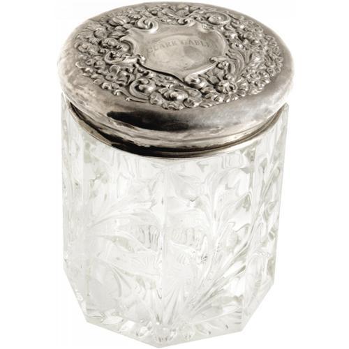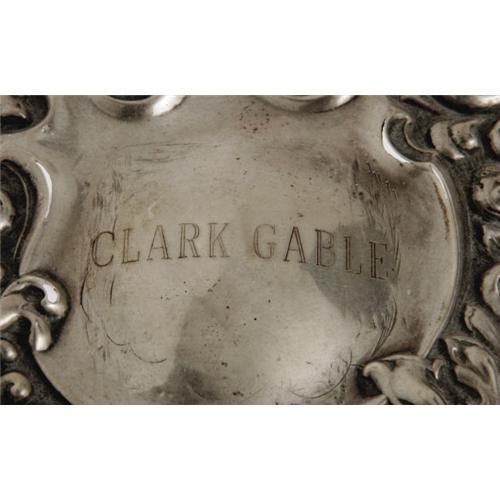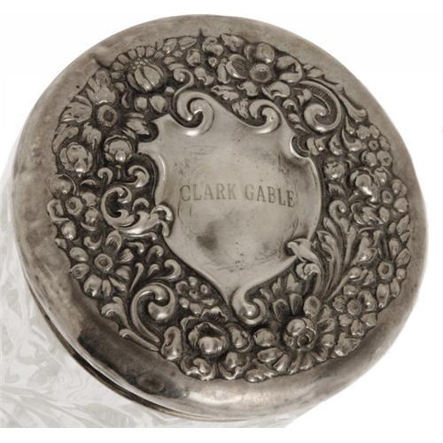<B>Clark Gable's Humidor.</B></I> A man known for a robust lifestyle, Clark Gable often indulged himself with a cigar. This glass humidor features a silver lid engraved with Gable's name on the top, and is in great condition with some moderate tarnishing and mild denting to the lid.