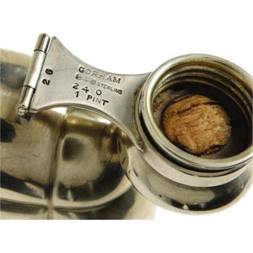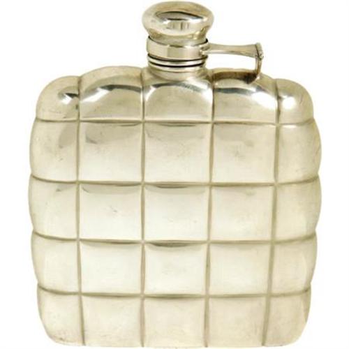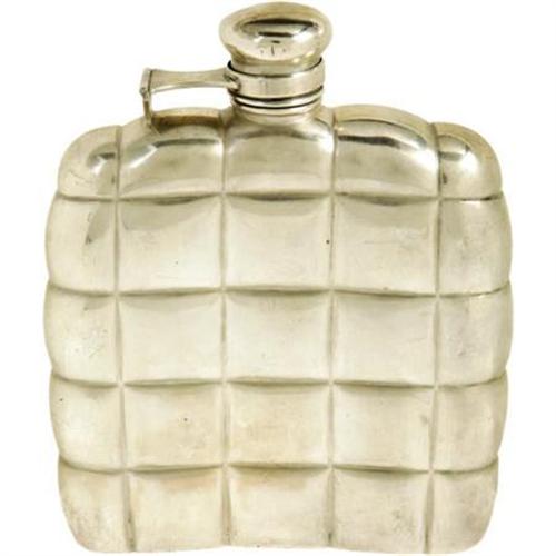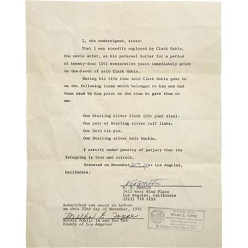 <B>Clark Gable's Whiskey Flask.</B></I> A 4.5" x 4.5" sterling silver whiskey flask owned and used by Clark Gable. Kept in almost pristine condition, the Gorham flask is accompanied by a notarized letter of authenticity from Gable's butler for over 24 years, R.B. Martin. The flask, a gift from Gable to Martin, is in gorgeous shape, with a screw-cap lid and a rounded checkerboard pattern. In Very Fine condition. <I> Accompanied by COA from Hollywood Prop Supply.</B></I><BR><BR><b>Shipping:</b> Miscellaneous Collectibles, Smal (<a target="_blank" href="http://www.heritageauctions.com/common/shipping.php">view shipping information</a>)