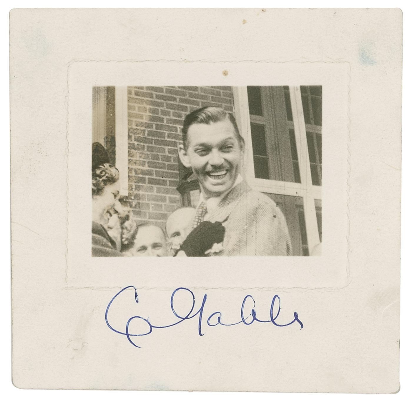 Vintage matte-finish 3.5 x 3.5 candid photo, signed in the lower border in blue ink, “C. Gable.” Notation on reverse of the photo reads, “Clark Gable-9-30-38 10:30 AM, Vet Hosp. Mpls.” In fine condition, with a few minor edge creases, and a bit of trivial soiling to borders. A very nice one-of-a-kind image capturing Gable in his prime.