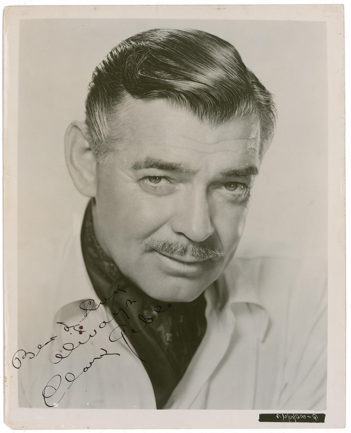 Dashing vintage glossy 8 x 10 head-and-shoulders photo, signed in fountain pen, “Best of luck always, Clark Gable.” In very good condition, with scattered light creases and surface marks, primarily to background and edges, a few small edge tears, light contrast to last name of signature, and a small spot of surface loss affecting a single stroke of signature.