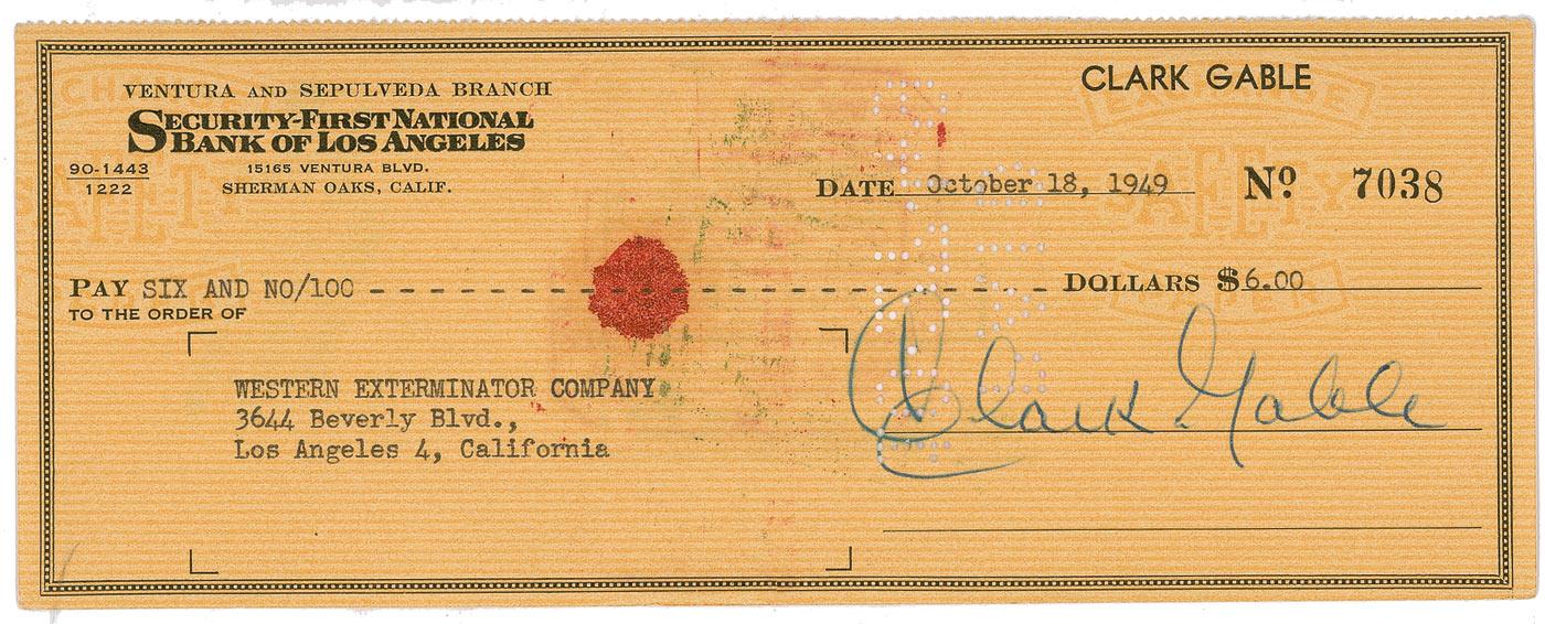 Personal check, 8.5 x 3.25, filled out in type and signed by Gable, payable to Western Exterminator Company for $6.00, October 18, 1949. Cancellation holes affecting beginning of signature, and show-through from stamps on reverse, otherwise fine condition.