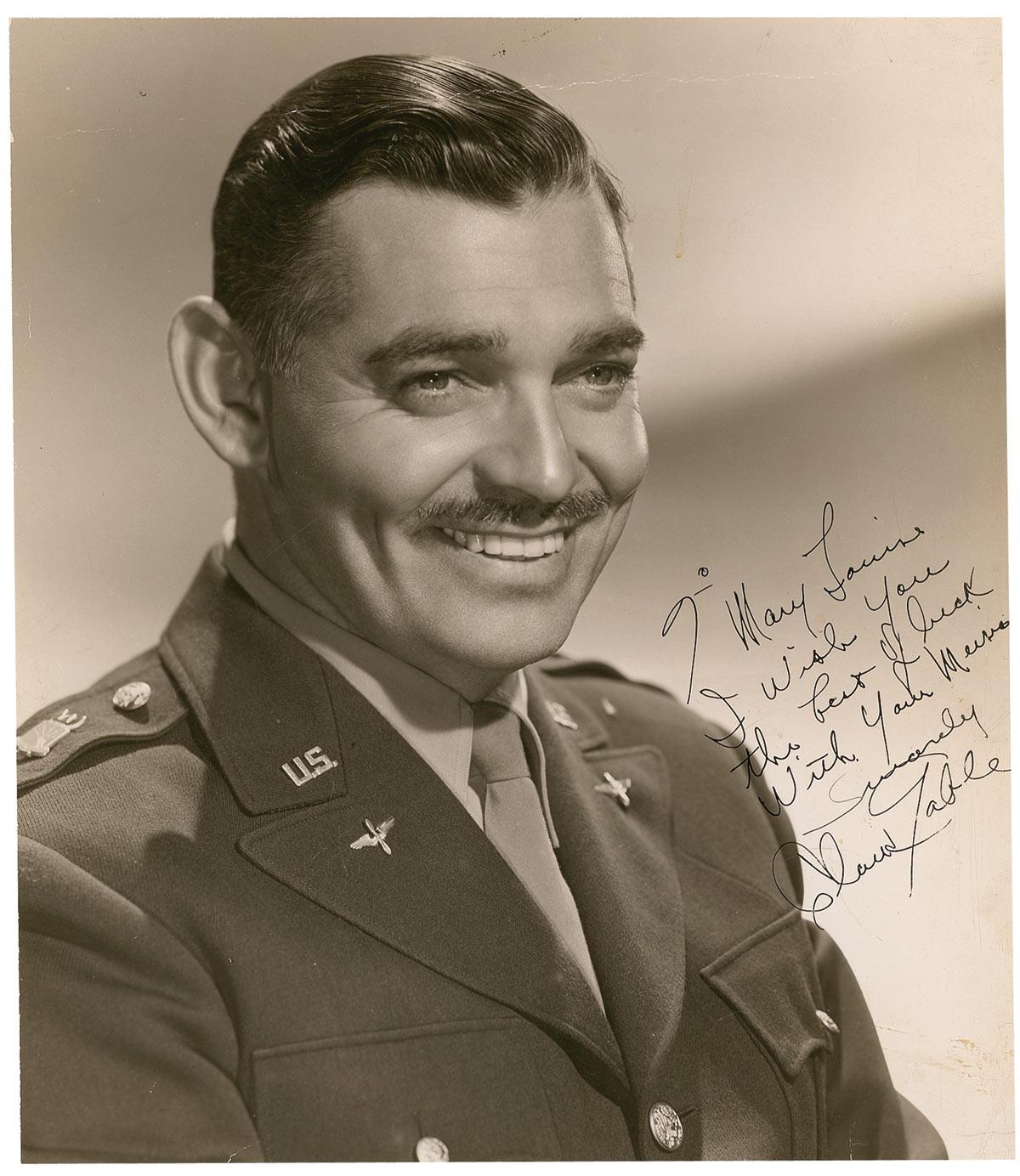 Vintage pearl-finish 9.5 x 11 photo of Gable in his military uniform, taken while serving in the Army Air Corps, signed and inscribed in fountain pen “To Mary Louise, I wish you the best of luck with your music, Sincerely, Clark Gable.” In good condition, with trimmed edges, scattered creases and surface marks, with some affecting signature, and a heavy horizontal crease along top edge.
