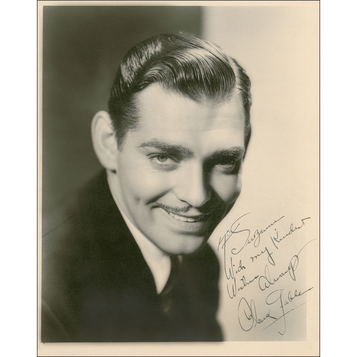 Vintage matte-finish 7.75 x 9.75 head-and-shoulders photo, signed and inscribed in fountain pen “To Suzanne, With my kindest wishes always, Clark Gable.” In fine condition, with scattered light silvering to darker areas of bottom portion of image. A handsome image of one of Hollywood’s most famous stars.
