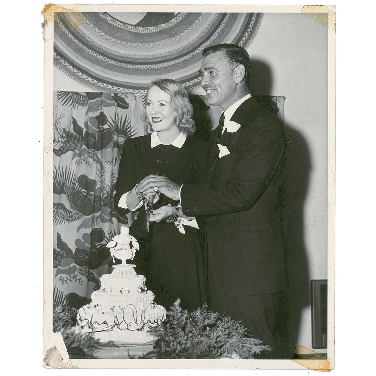 Vintage matte-finish 8 x 10 photo of Gable and his wife Sylvia Ashley cutting their wedding cake, signed in fountain pen, “Sylvia,” and “& Clark.” In very good condition, with old tape to three corners, surface loss to the fourth corner, some scattered light creases and spotting, and light contrast to end of Gable’s signature.