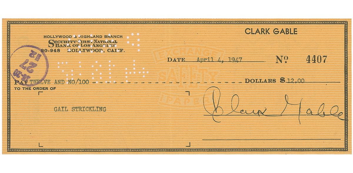 Personal check, 8.25 x 3.25, filled out in type and signed by Gable, payable to Gail Strickling for $12.00, April 4, 1947. In fine condition, with a central vertical fold, expected cancellation holes, and slight brushing to a single letter of the signature.