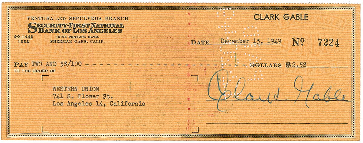 Personal check, 8.25 x 3.25, filled out in type and signed by Gable, payable to Western Union for $2.58, December 15, 1949. Cancellation holes affecting beginning of signature, show-through from stamps on reverse, and some light brushing to first letter of signature, otherwise fine condition.
