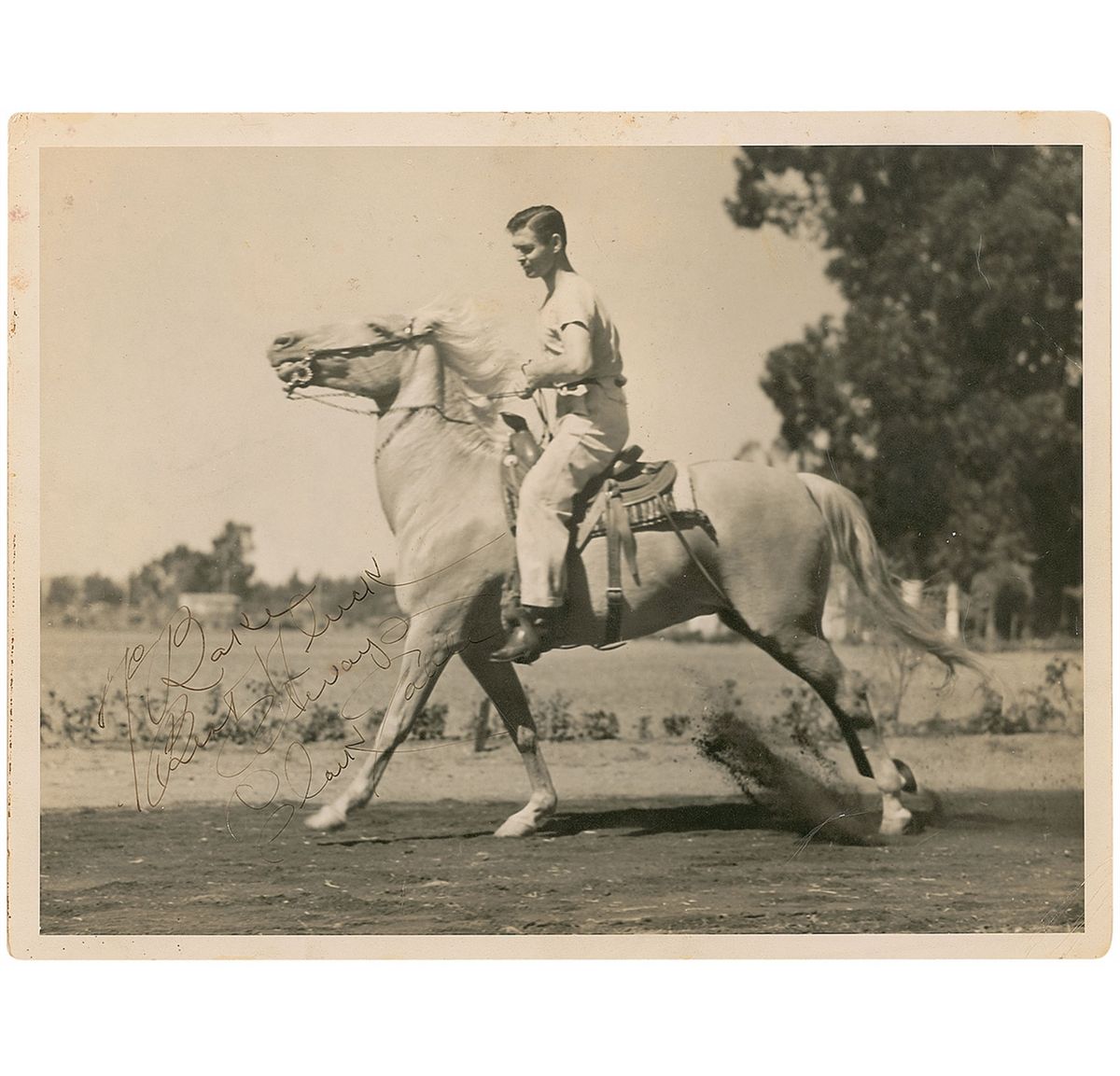 Vintage oversized matte-finish 12.75 x 10 MGM publicity photo, credited on the reverse to Grimes, of Gable atop a horse, signed and inscribed in fountain pen, “To Bake, Best of luck always, Clark Gable.” In very good condition, with some light contrast to last name of signature, some scattered surface creases, mainly to corners and right edge, and some mild edge wear.