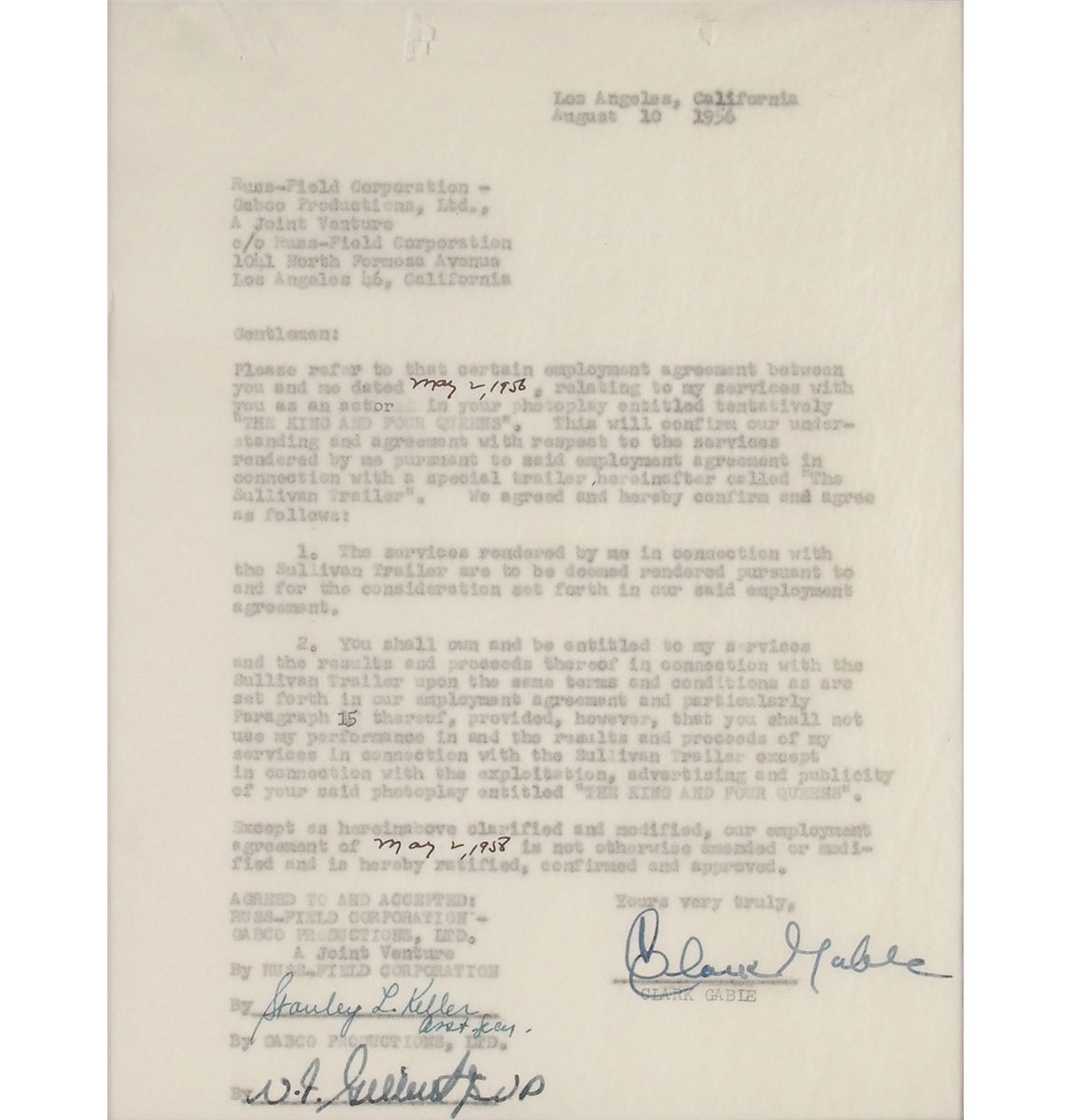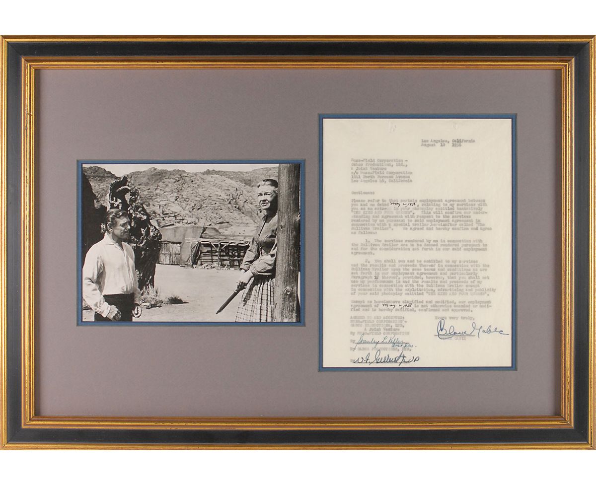 DS, one page, 8 x 10.25, August 10, 1956. Agreement between Gable and Gabco Productions relating to his “services with you as an actor in your photoplay entitled…‘The King and Four Queens.’ This will confirm our understanding…in connection with a special trailer hereinafter called ‘The Sullivan Trailer.’” Attractively double-matted and framed with a still from the film to an overall size of 25 x 17.5. In fine condition, with expected document wear. Oversized.