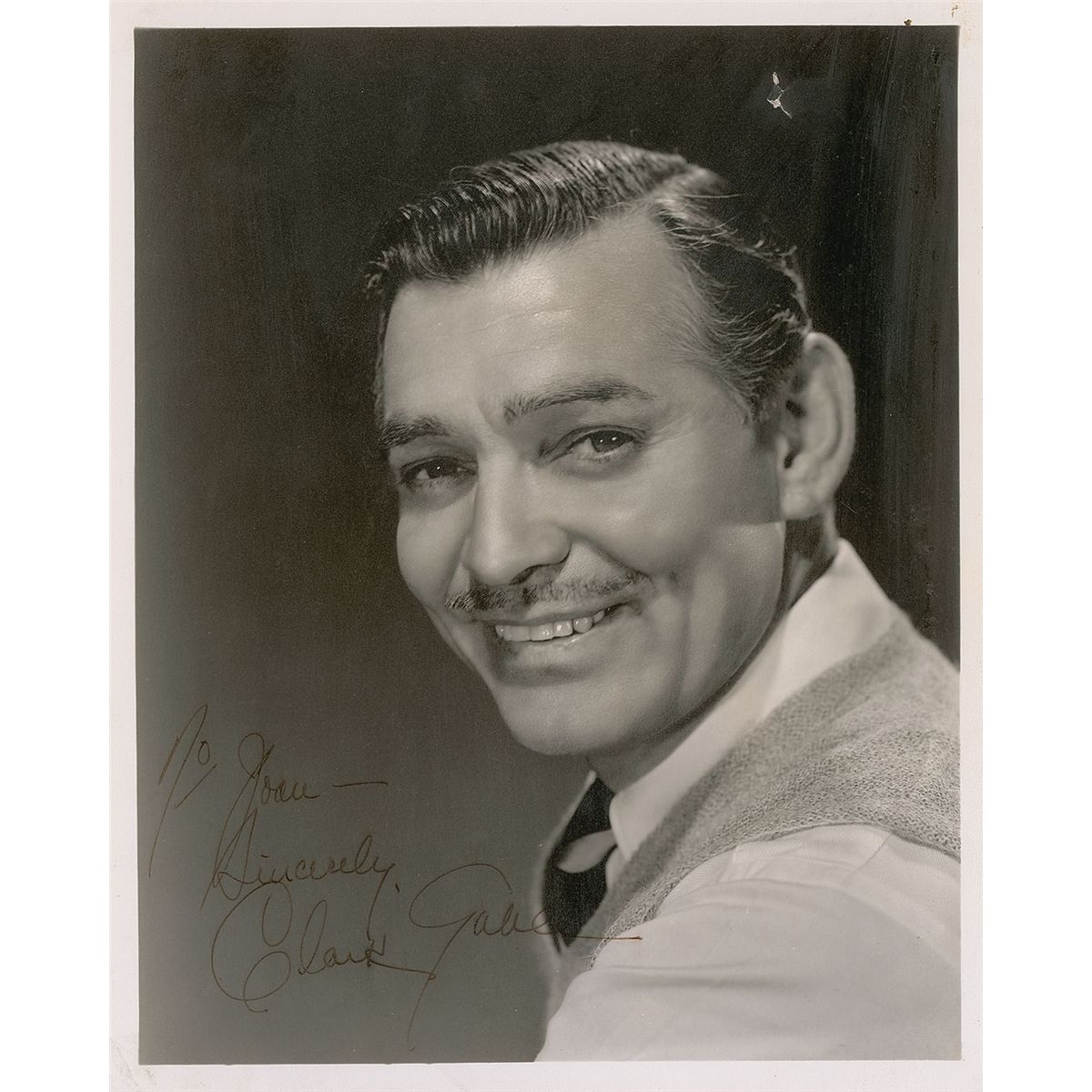 Handsome matte-finish 8 x 10 head-and-shoulders photo, signed and inscribed in fountain pen, “To Joan—Sincerely, Clark Gable.” In very good condition, with small tear to background near top edge, some light bends, and mounting and adhesive remnants to reverse.