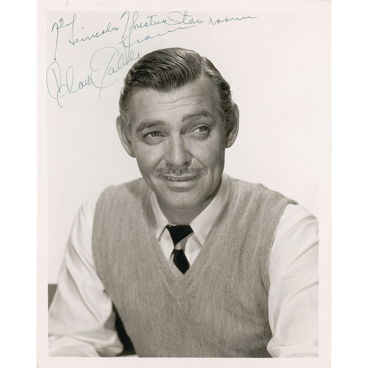 Handsome matte-finish 8 x 10 MGM publicity photo, signed and inscribed in ballpoint, “To Lincoln Theatre’s Star Room, from Clark Gable.” In fine condition, with a paperclip impression and small creases to the top edge.