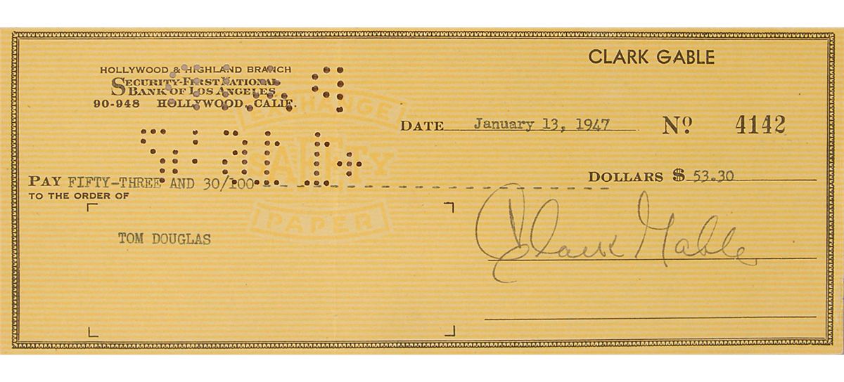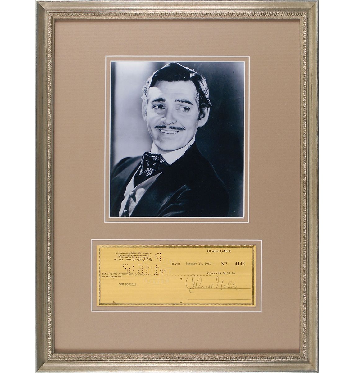 Personal check, 8.25 x 3, filled out in type and signed by Gable, payable to Tom Douglas for $53.30, January 13, 1947. Superbly double-matted and framed with a portrait of Gable to an overall size of 14.75 x 19.5. In fine condition, with a central vertical fold and expected cancellation holes.