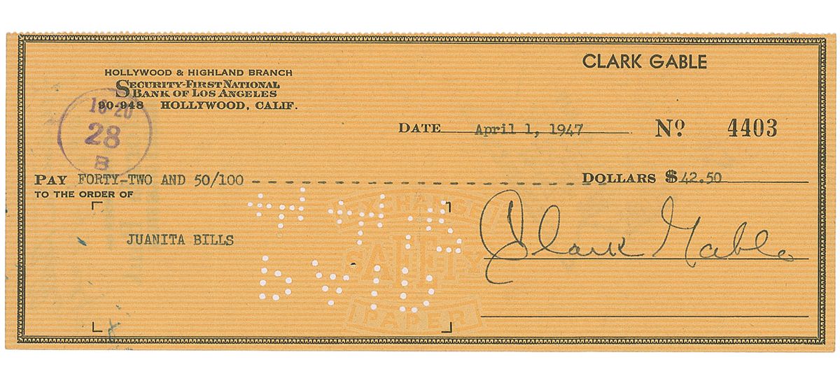 Personal check, 8.25 x 3.25, filled out in type and signed by Gable, payable to Juanita Bills for $42.50, April 1, 1947. In fine condition, with three vertical folds (one fold passing through a single letter of the signature), and expected bank stamps and cancellation holes. Accompanied by a handsome photo of Gable from Gone with the Wind.