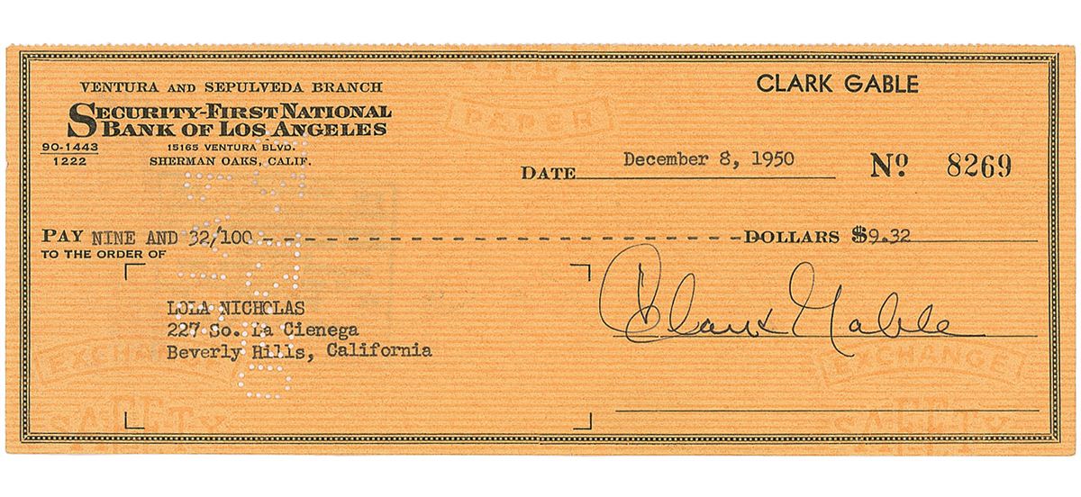 Personal check, 8.25 x 3.25, filled out in type and signed by Gable, payable to Lola Nicholas for $9.32, December 8, 1950. In fine condition, with expected bank stamps and cancellation holes.
