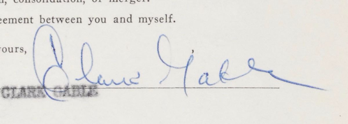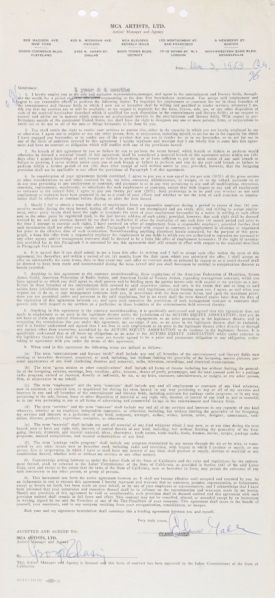 DS, one page, 8.5 x 18, December 3, 1953. Artist’s manager contract between Gable and MCA Artists Limited, for a period of one year and four months, for the standard 10 percent commission. Signed at the conclusion by Gable, who also initials the document twice. In fine condition, with expected document wear.