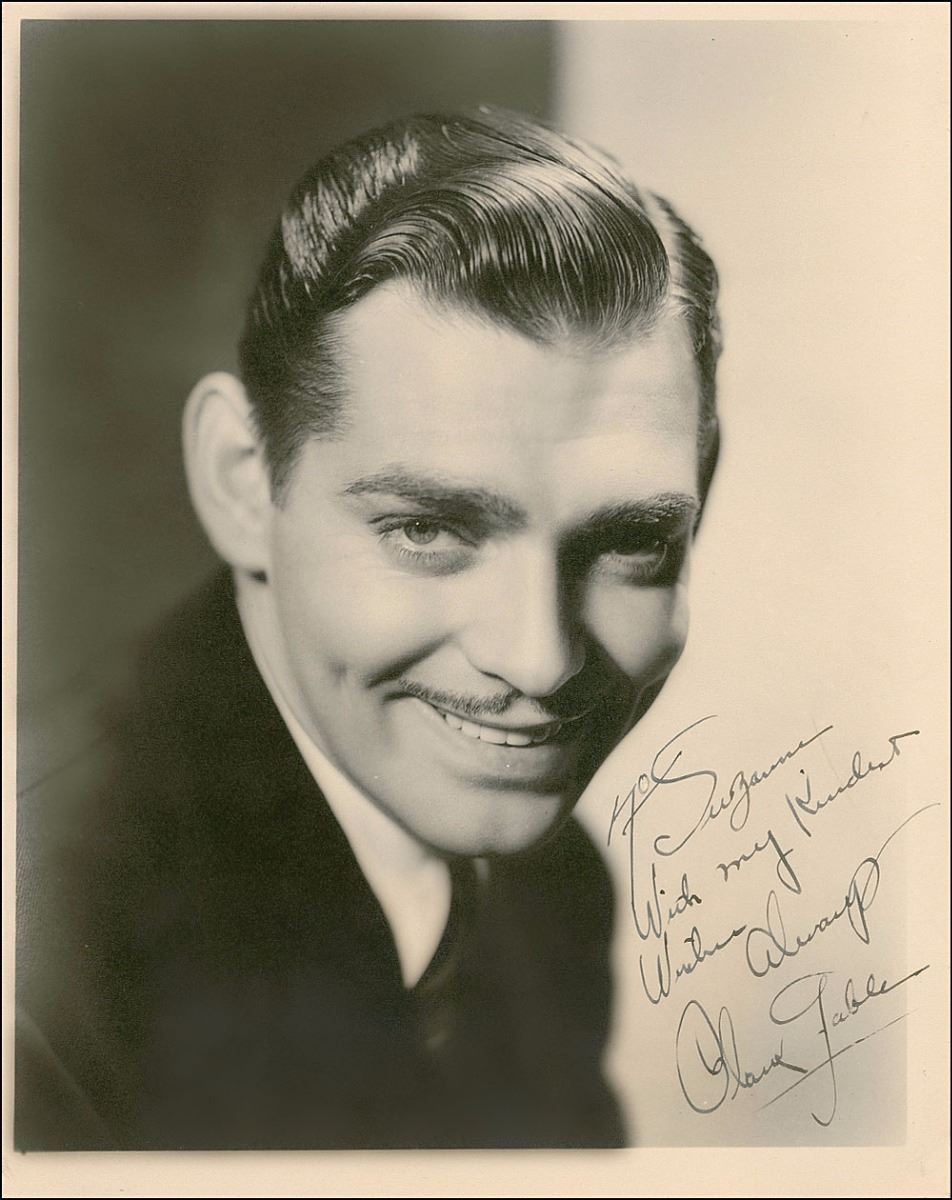 Vintage matte-finish 7.75 x 9.75 head-and-shoulders photo, signed and inscribed in fountain pen, “To Suzanne, With my kindest wishes always, Clark Gable.” In fine condition, with trimmed edges. A handsome image of one of Hollywood’s most famous actors.