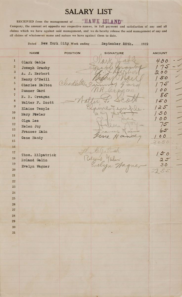 DS, one page, lightly lined, 8.5 x 14, September 28, 1929. Salary list (payroll voucher) for the Broadway play Hawk Island, signed in pencil by Gable and sixteen other members of the production; Gable’s name appears first and lists him as the highest earner with $400. In very good to fine condition, with overall light soiling, and splitting along folds.