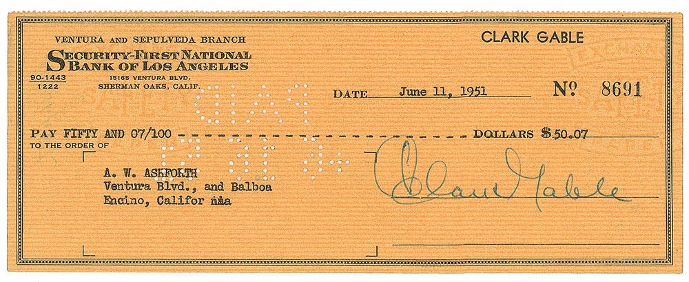 Personal check, 8.25 x 3.25, filled out and signed by Gable, payable to A. W. Ashforth for $50.07, stamp-dated June 11, 1951. In fine condition. Gable appeared in one film in 1951, an adaptation of Bernard DeVoto's 1947 book, Across the Wide Missouri.