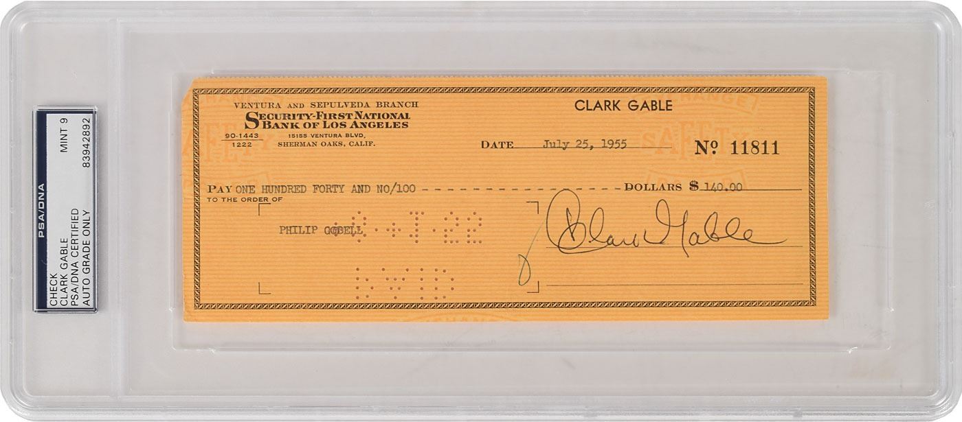 Personal check, 8.25 x 3.25, filled out in type and signed by Gable, payable to Philip Godell for $140, July 25, 1955. Encapsulated in a plastic PSA/DNA authentication and grading holder, evaluating the autograph as "MINT 9." In fine condition.