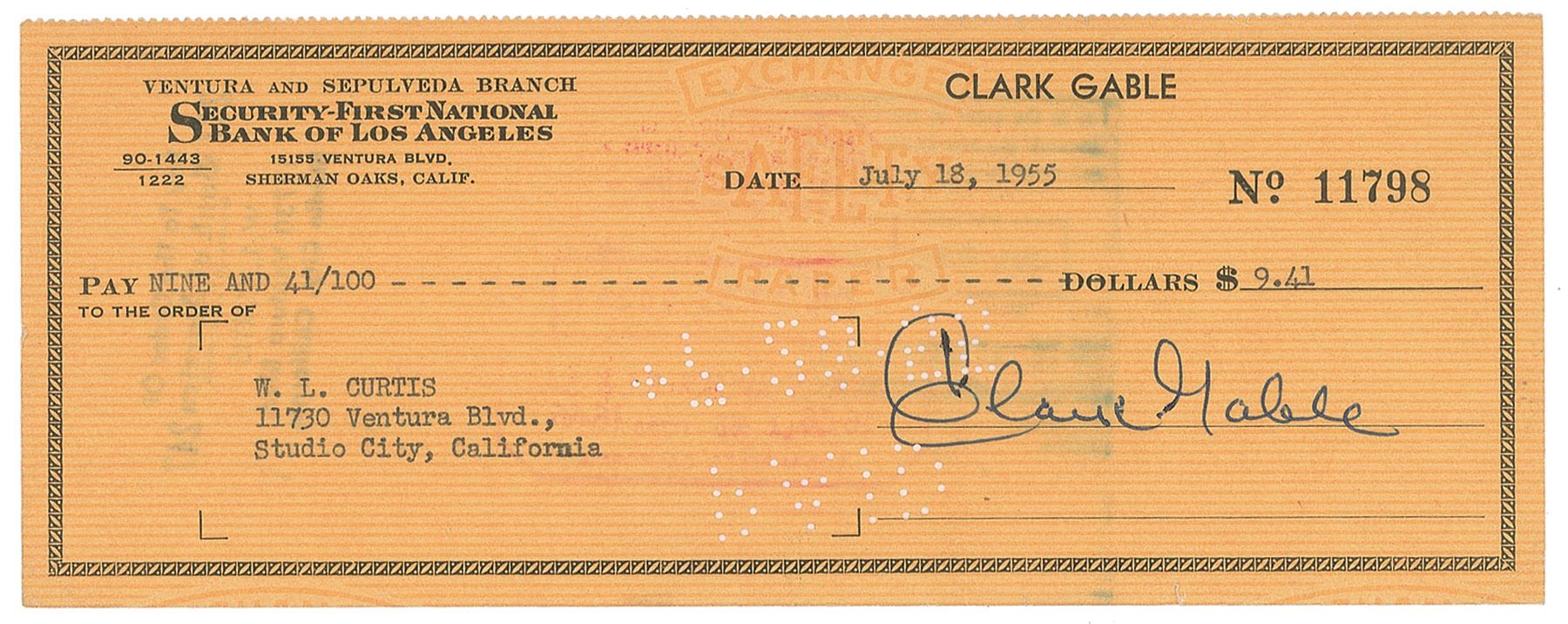 Personal check, 8.25 x 3.25, filled out in type and signed by Gable, "Clark Gable," payable to W. L. Curtis for $9.41, July 18, 1955. In fine condition.