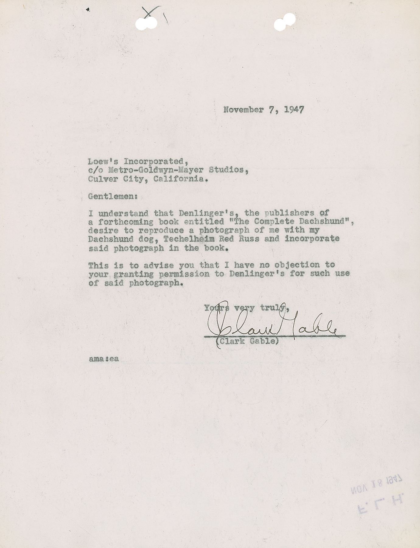 DS, one page, 8.5 x 11, November 7, 1947. Official letter addressed to Loew's Incorporated, in full: "I understand that Denlinger's, the publishers of a forthcoming book entitled 'The Complete Dachshund,' desire to reproduce a photograph of me with my Dachshund dog, Techelheim Red Russ and incorporate said photograph in the book. This is to advise you that I have no objection to your granting permission to Denlinger's for such use of said photograph." Signed at the conclusion in black ink by Clark Gable. In fine condition, with light show-through at the bottom from a filing stamp on the reverse.