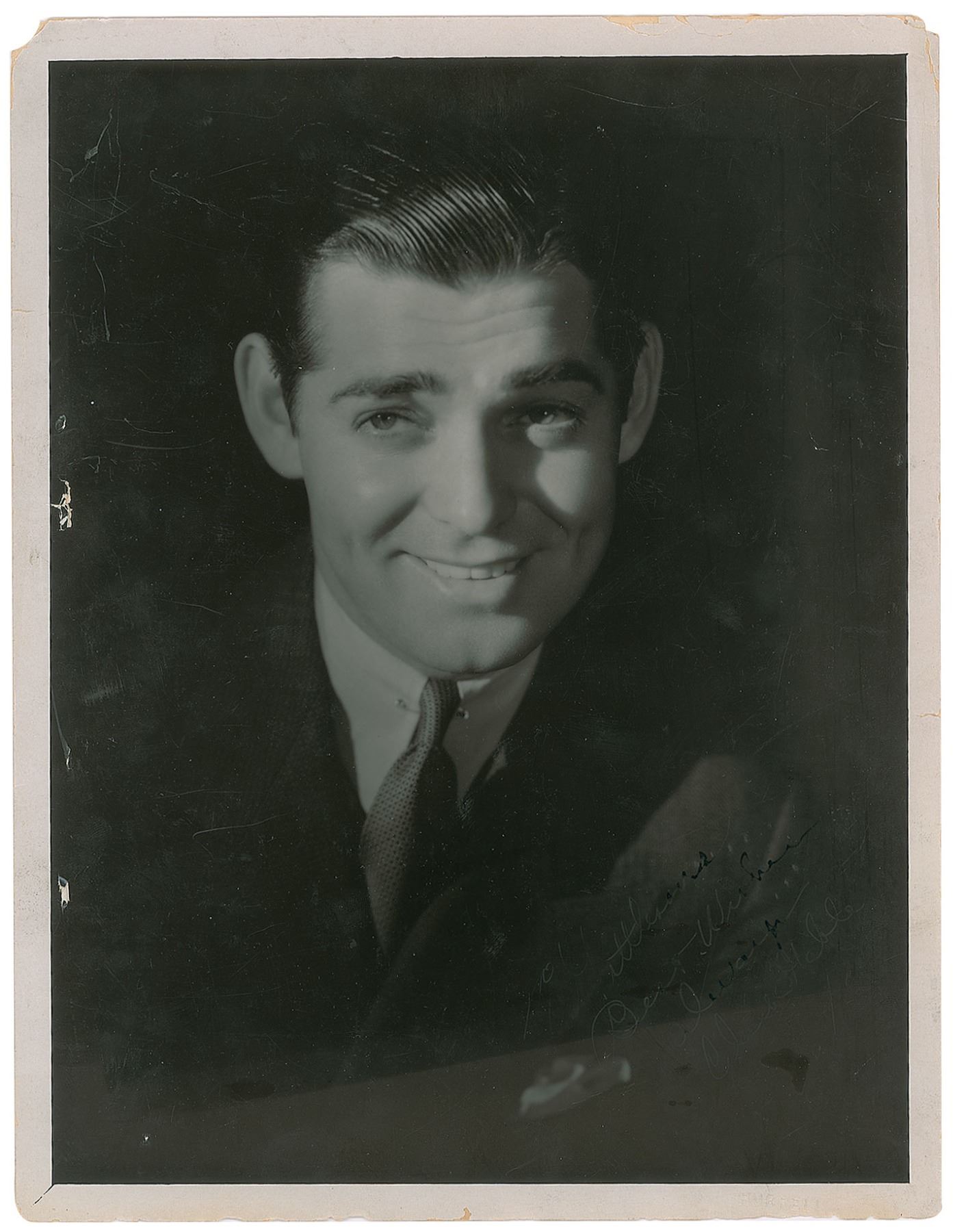 Vintage pearl-finish 10 x 13 photo of Clark Gable by noted Hollywood photographer George Hurrell, signed and inscribed in fountain pen, "To Mittleson's, Best wishes always, Clark Gable.” Lower left border features a Hurrell blindstamp, and reverse bears a Hurrell/MGM stamp. In very good to fine condition, with some creasing, loss to upper corner tips, small areas of damage along the left side, and very poor signature contrast.