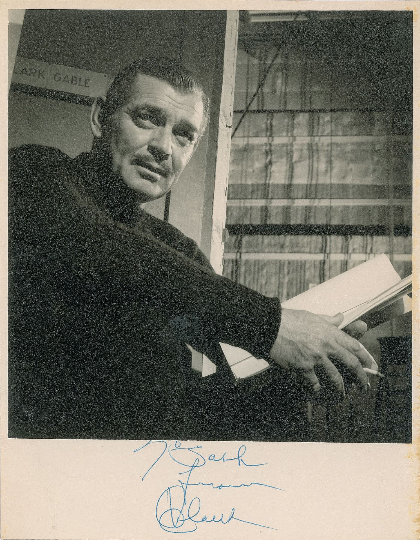 Vintage matte-finish 7.75 x 10 photo of Clark Gable seated on set with a script and cigarette, signed and inscribed in blue ballpoint, "To Sarah, from Clark.” In fine condition, with some light toning to evenly trimmed edges, and a small area of discoloration near his knee.