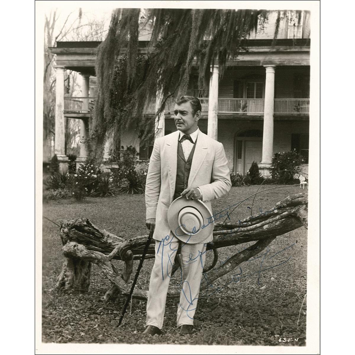 Vintage matte-finish 8 x 10 photo of Gable as Hamish Bond from the 1957 film Band of Angels, signed and inscribed in fountain pen “To Scotty, Best wishes, Clark G—.” In fine condition, with some light edge rippling and moderate contrast to signature and portion of inscription. The film proved to be a complete failure on release, both critically and commercially. Gable was annoyed by the comparisons with Gone With the Wind and decided to part company with Raoul Walsh, previously one of his favorite directors.