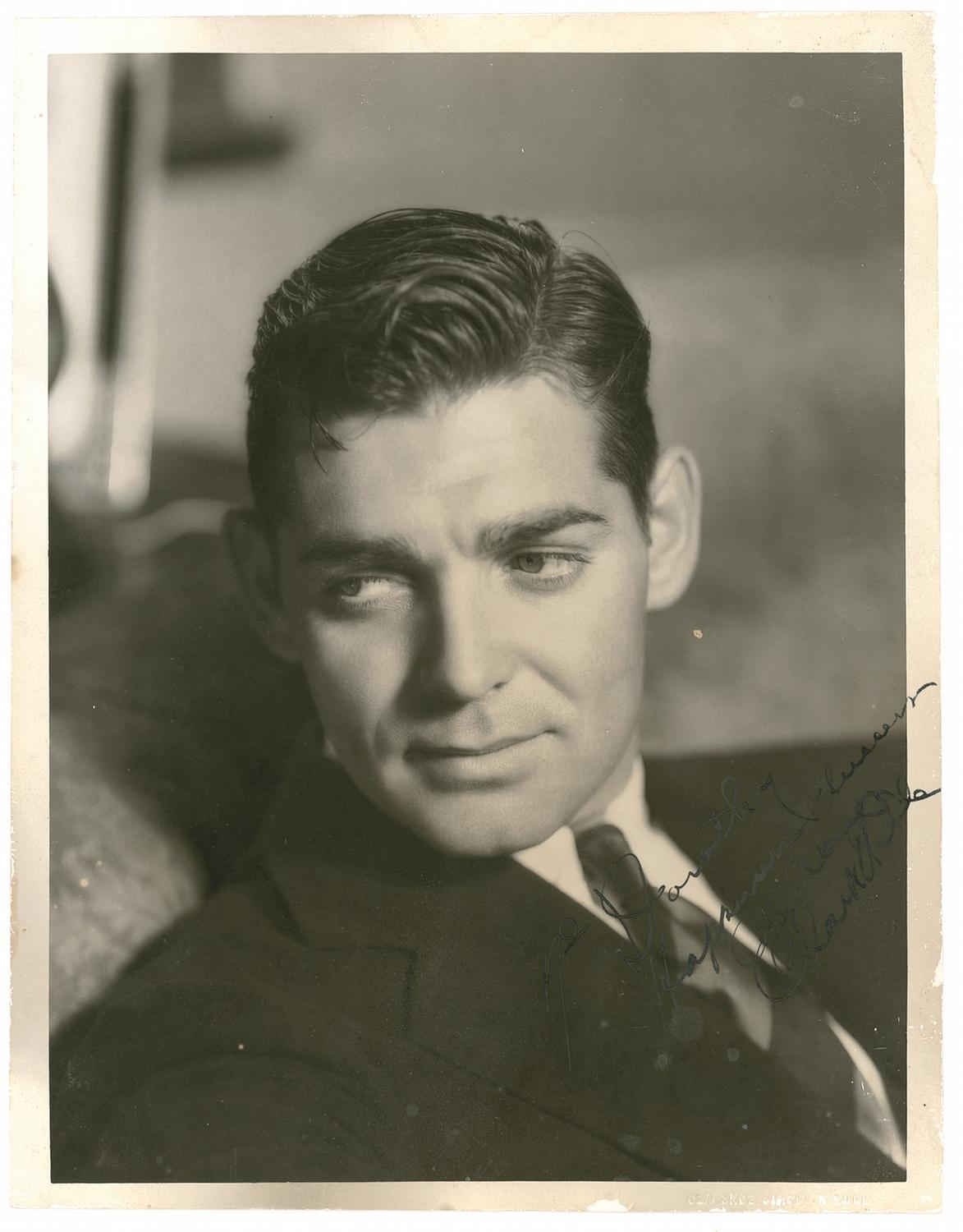 Exceptionally handsome vintage pearl-finish 10 x 13 Clarence Sinclair Bull photo of Gable, noted as being the age of 34 on the reverse, signed and inscribed in fountain pen to child actress Dorothy Gray, “To Dorothy, Happiness & success always, Clark Gable.” In very good condition, with scattered light bends and creases, a bit of scattered light surface loss to borders and edges, light crazing and spotting to finish, as well as some light spots to bottom portion of image. Gable and Gray appeared together in the 1934 film Men in White. Accompanied by a photocopied photo of Gray and Gable from the film.