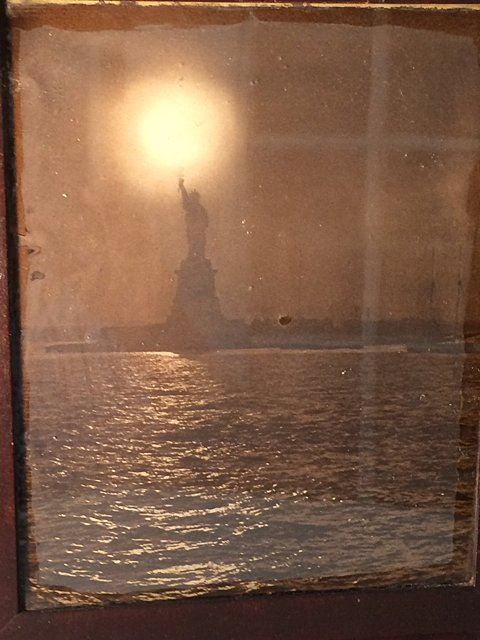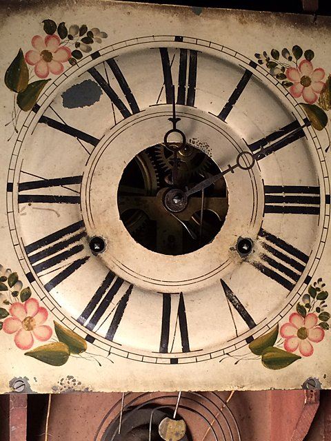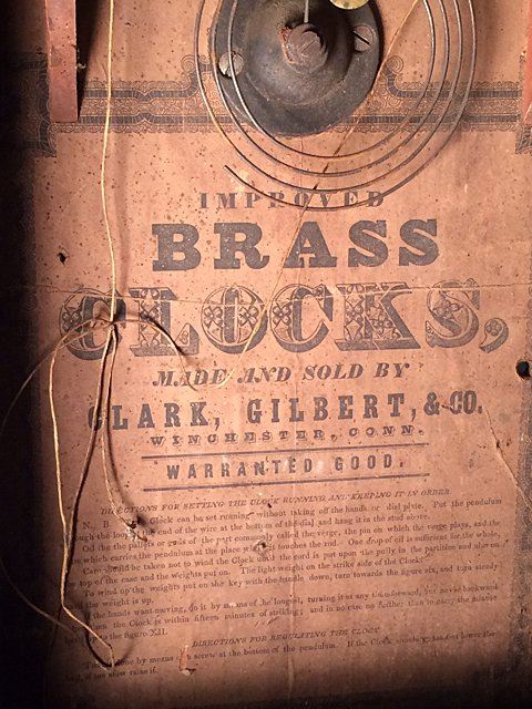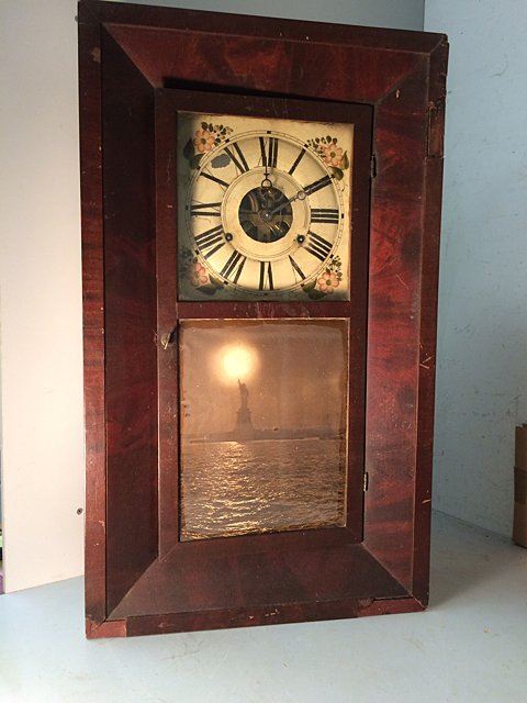 Clark, Gilbert & Co., Winchester, CT, OG Shelf Clock. Brass works with beautiful lower glass featuring the Statue of Liberty, Ellis Island. Beautiful grain work, hand painted dial with flowers in each corner. Very nice label "Improved Brass Clocks, Made and Sold by Clark, Gilbert, & Co., Winchester, Conn."