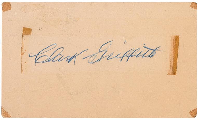 Ballpoint signature, “Clark Griffith,” on an off-white 5.5 x 3.25 government postcard postmarked September 26, 1949. In very good condition, with generally uniform toning (a slightly lighter block surrounding his name), scattered soiling, and areas of old adhesive tape residue at the corners and to the left and right of his name.