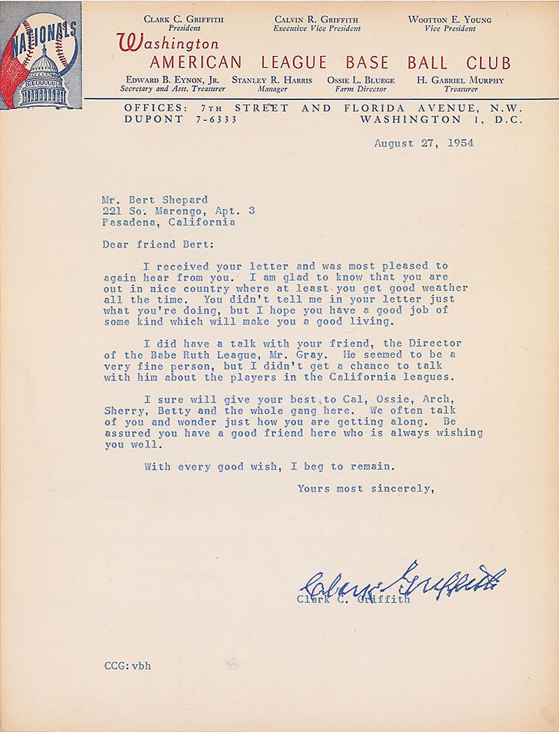 TLS, one page, 8.5 x 11, Washington Nationals letterhead, August 27, 1954. Letter to Bert Shepard. In full: “I received your letter and was most pleased to again hear from you. I am glad to know that you are out in nice country where at least you get good weather all the time. You didn’t tell me in your letter just what you’re doing, but I hope you have a good job of some kind which will make you a good living. I did have a talk with your friend, the Director of the Babe Ruth League, Mr. Gray. He seemed to be a very fine person, but I didn’t get a chance to talk with him about the players in the California leagues. I sure will give your best to Cal, Ossie, Arch, Sherry, Betty and the whole gang here. We often talk of you and wonder just how you are getting along. Be assured you have a good friend here who is always wishing you well.” In fine condition. Accompanied by a certificate of authenticity from PSA/DNA.