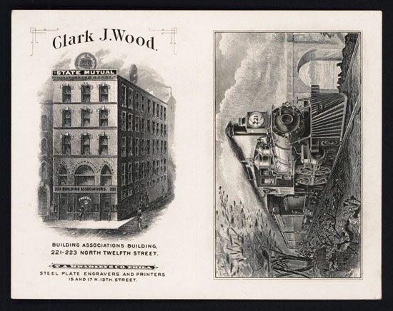 Philadelphia, Pennsylvania, ND (ca. 1880-90), Unfolded Business or calling card printed by T.A. Bradley, a predecessor company to Security Bank Note Co., 4.8 x 4 inches, black intaglio printing on light peach colored card that is scored in the middle so it could be folded, but this is unfolded. Speeding locomotive #221 on right, State Mutual Building with Clark J. Wood on top on left, T.A. Bradley imprint on bottom, Unc. to CU condition.
