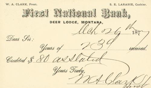 WILLIAM A. CLARK. ADS. 1pp. 5" x 3". Deer Lodge, Montana. Mch 26th 1877. A "First National Bank" receipt signed "W. A. Clark Prest". Clark also filled out the partly printed document: "Dear Sir Yours of 23d received. Credited $80 as stated". It is in very fine condition overall.