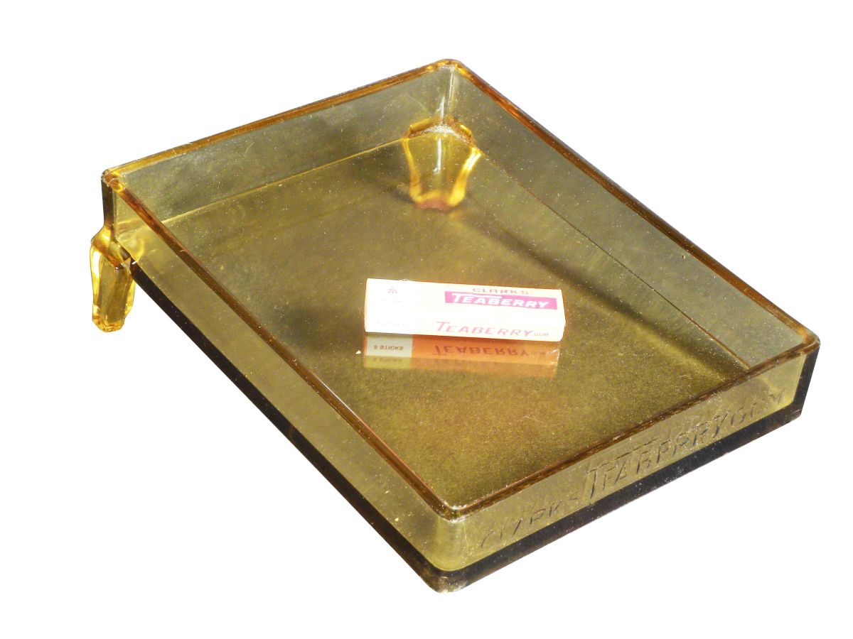 Clark's Teaberry Gum Glass Counter Display. Tiny chip on one leg and one corner otherwise excellent condition. 6 3/4 X 3 X 9 inches.