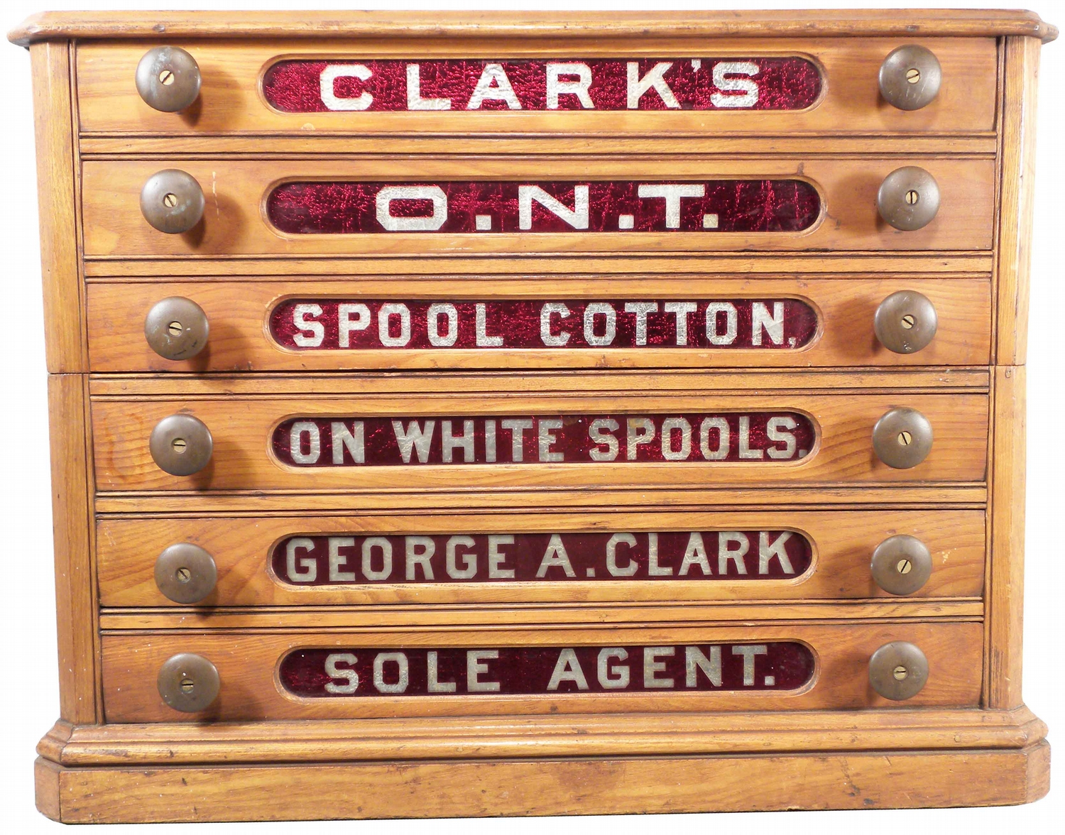 Clarks ONT Salesman Sample Spool Cabinet Front. Front has ruby glass drawer fronts with wood knobs. The back has panel finish, it folds to travel. 29 X 22 X 3 inches.