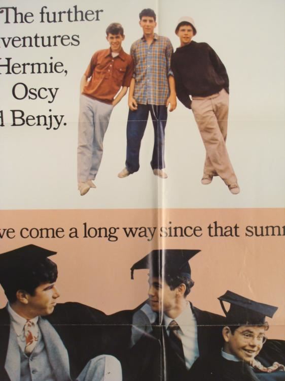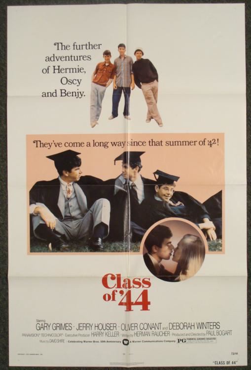 Here is an original poster from the 1973 movie Class of 44. This Sequel to Summer of '42 reunites the stars as they graduate from high school, and this charming poster shows their characters from both eras. Size: 27 x 41 inches (one sheet) Condition: Very good; light wear at the folds, and surface wrinkles