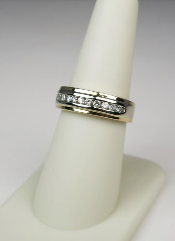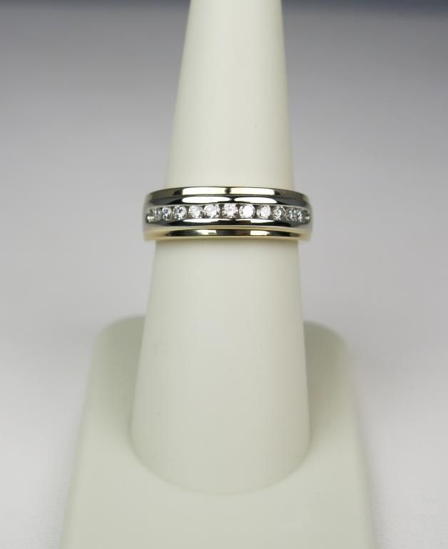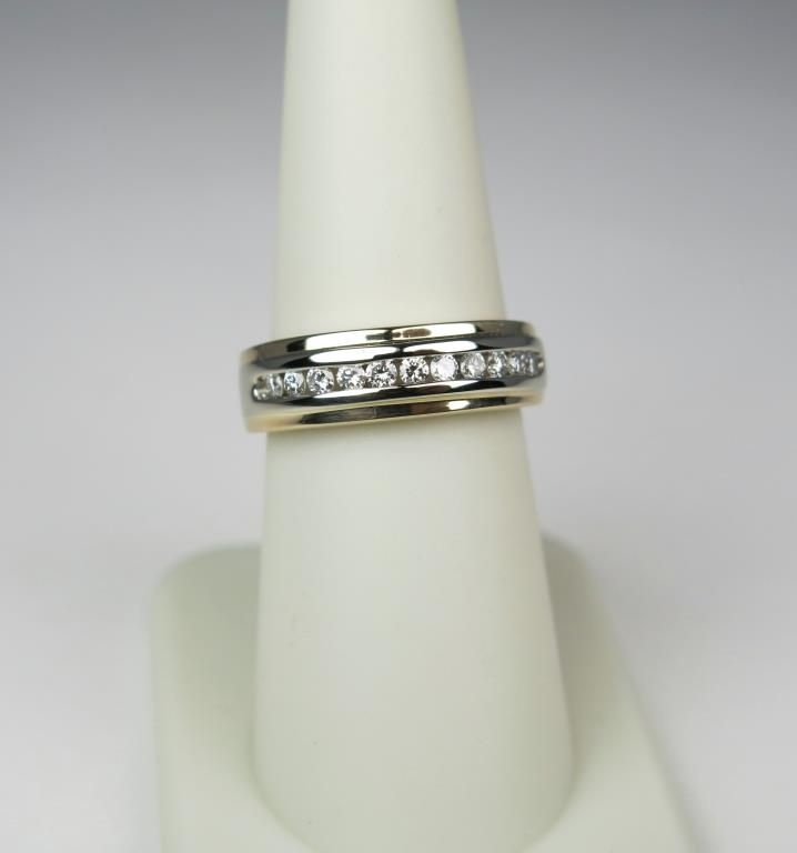 Classic 14 karat yellow gold ladies or gents ring channel set with 11 round diamonds weighing approx. 0.33 carats of G-H colors and SI clarity. Retail $1,000-$1,500 Estimate $600-$900