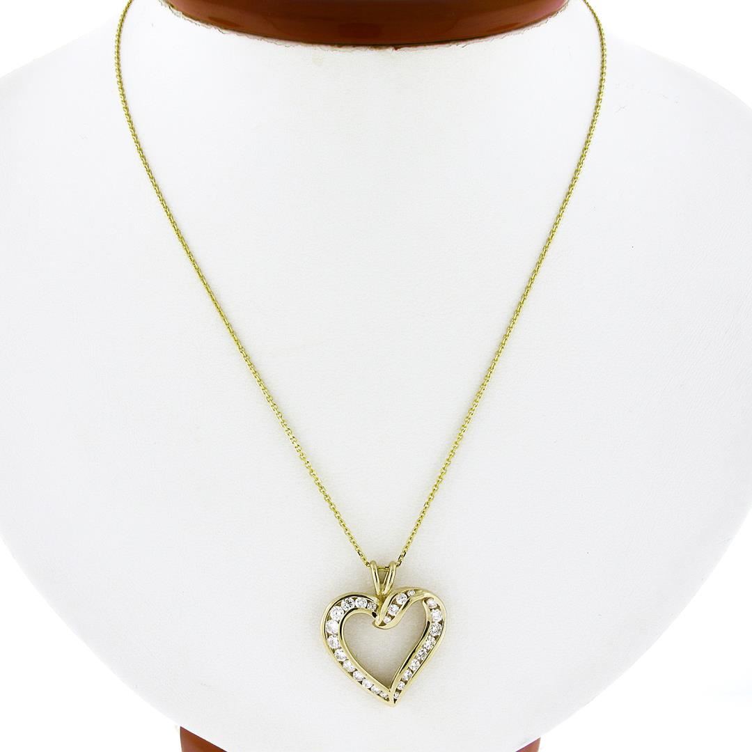 A solid 14k yellow gold heart pendant necklace, with 25 round brilliant cut natural diamonds (G/H - SI1/SI2 ; 1ctw). Adjustable 16 to 18 inch cable link chain, 5.41 grams total weight, pendant measures 20.80x21.50mm.