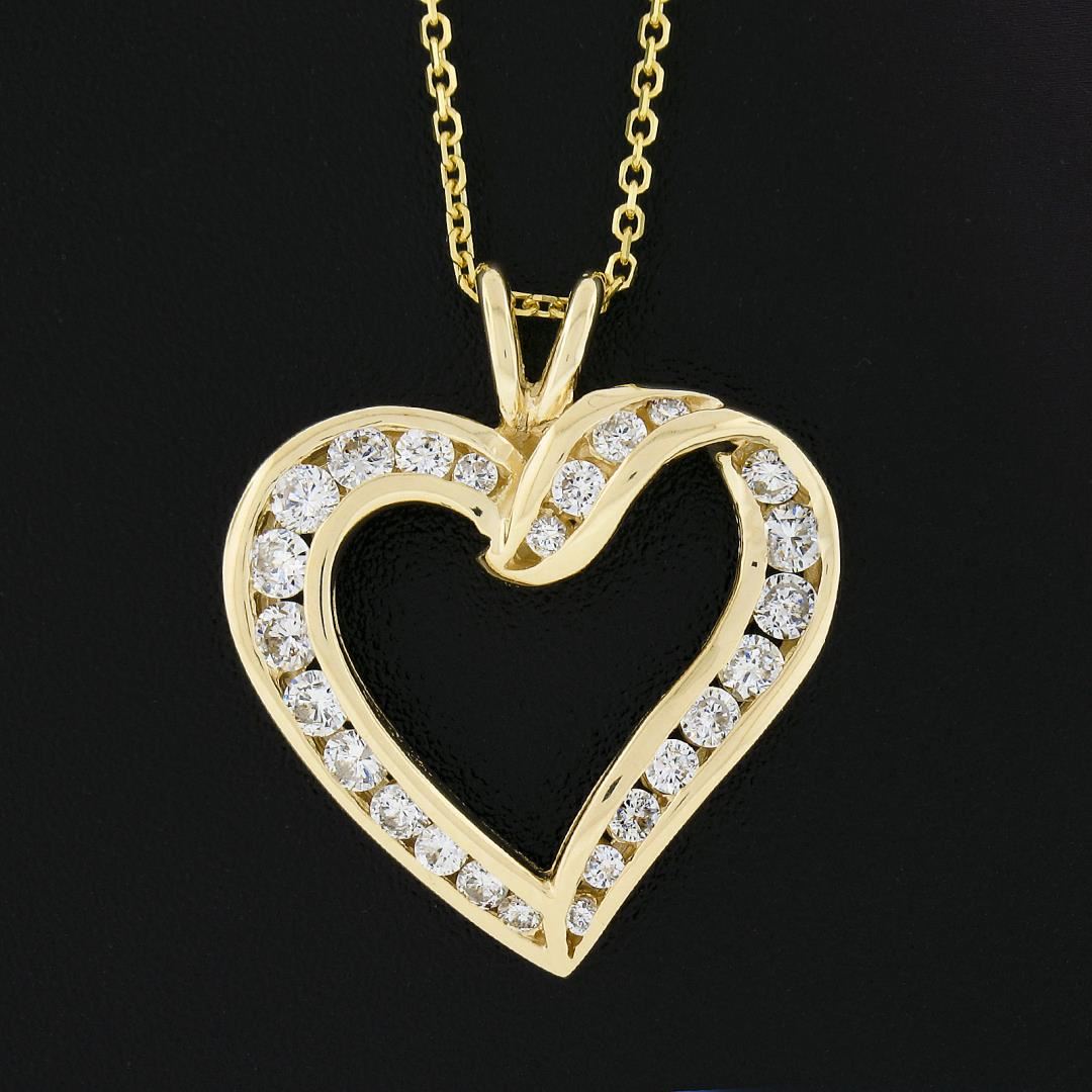 A solid 14k yellow gold heart pendant necklace, with 25 round brilliant cut natural diamonds (G/H - SI1/SI2 ; 1ctw). Adjustable 16 to 18 inch cable link chain, 5.41 grams total weight, pendant measures 20.80x21.50mm.