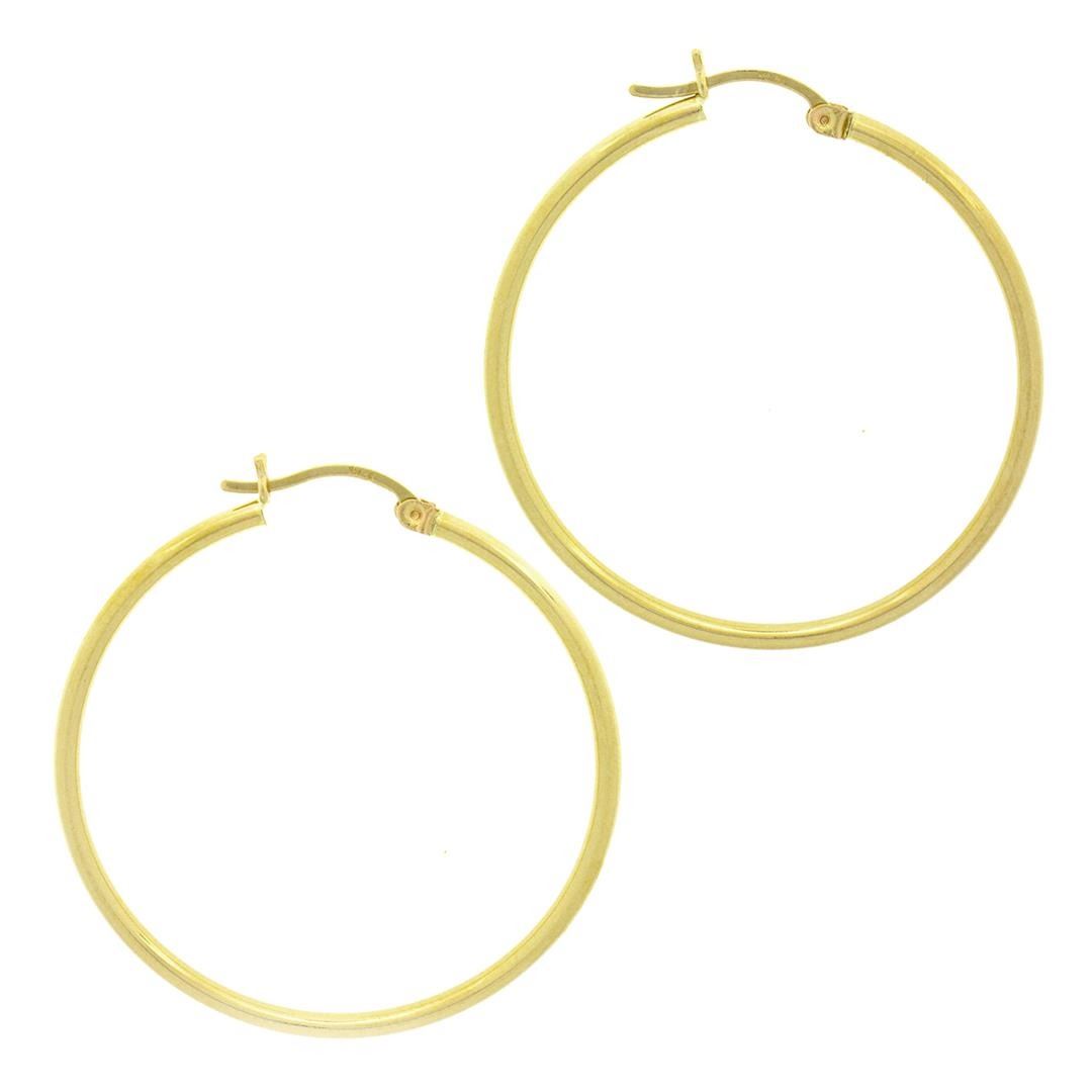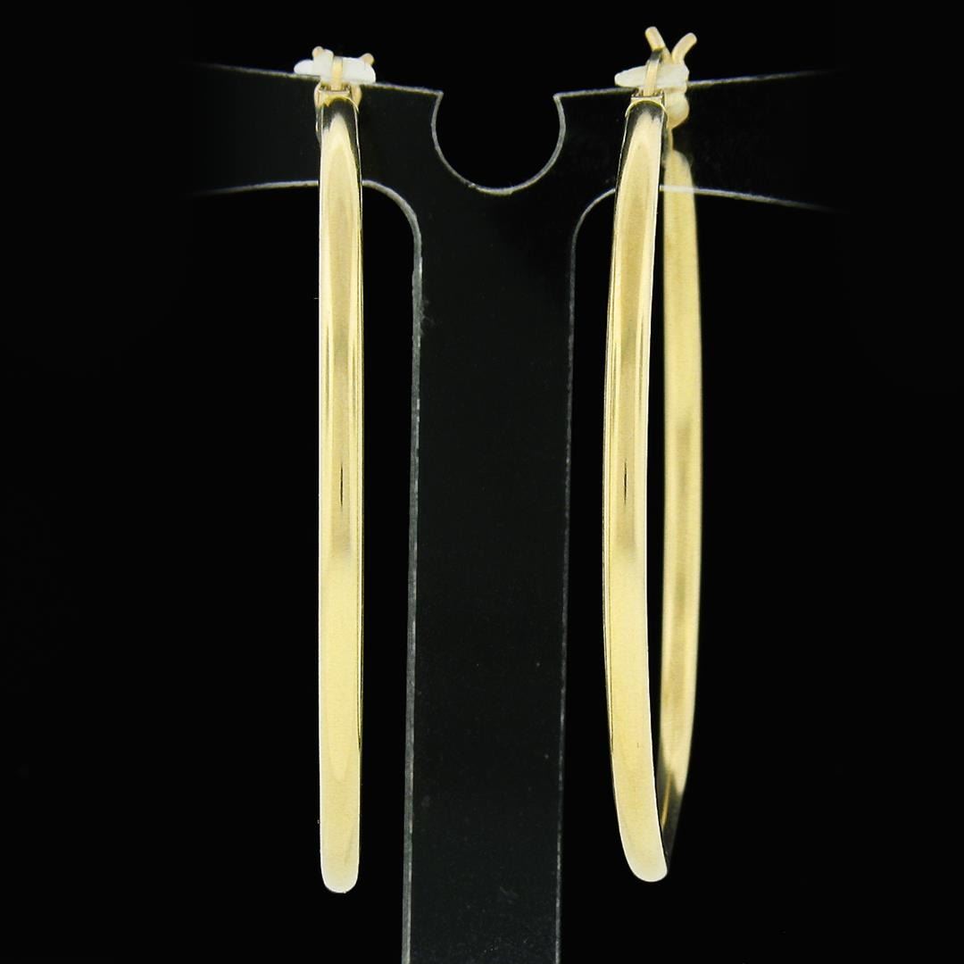 A solid 14k yellow gold hoop earrings. The earrings measure approximately 39.80mm in diameter and weigh a total of 2.70 grams.