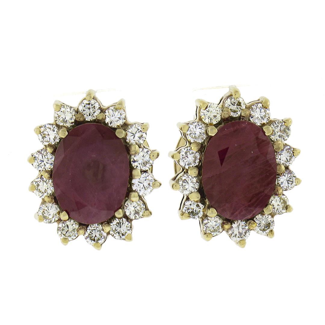A solid 14k yellow gold stud earrings, with 2 oval cut natural rubies (8x6mm ), surrounded with a halo of 28 round cut natrual diamonds (I/J  - VS2-SI2 ; 0.56ctw). The earrings measure approximately 12.7x10.8mm and weigh a total of 5.32 grams.