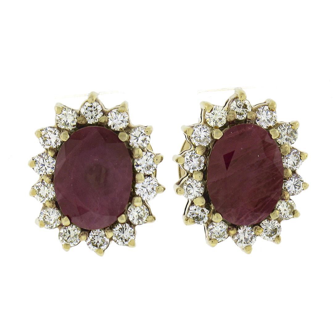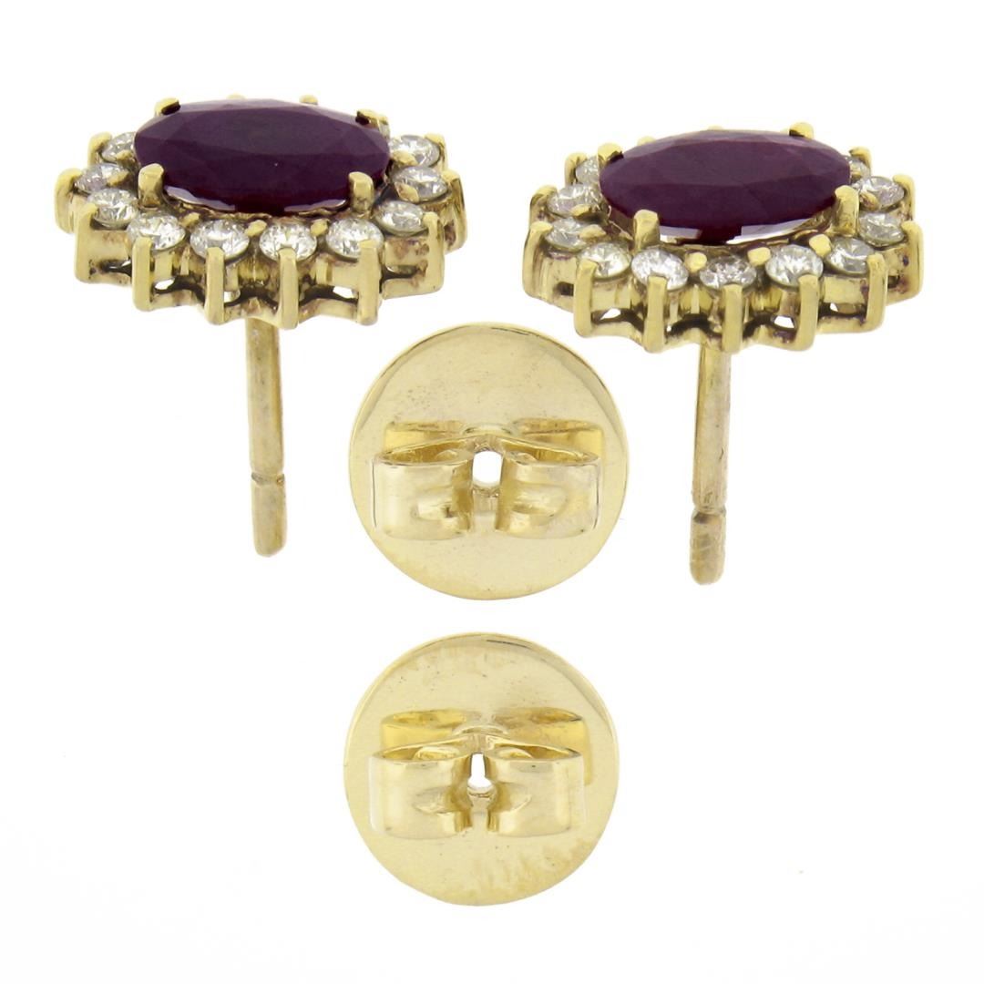 A solid 14k yellow gold stud earrings, with 2 oval cut natural rubies (8x6mm ), surrounded with a halo of 28 round cut natrual diamonds (I/J - VS2-SI2 ; 0.56ctw). The earrings measure approximately 12.7x10.8mm and weigh a total of 5.32 grams.