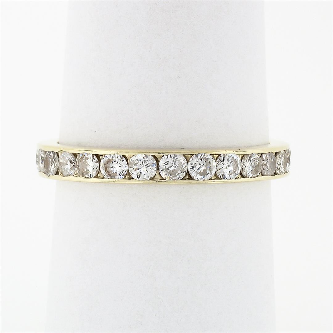 A solid 14k yellow gold wedding band ring, with 23 round brilliant cut natural diamonds (G/H - VS2/SI1 ; 1ctw). The ring is size 7.0, weighs a total of 2.15 grams, and measures 2.8mm wide.