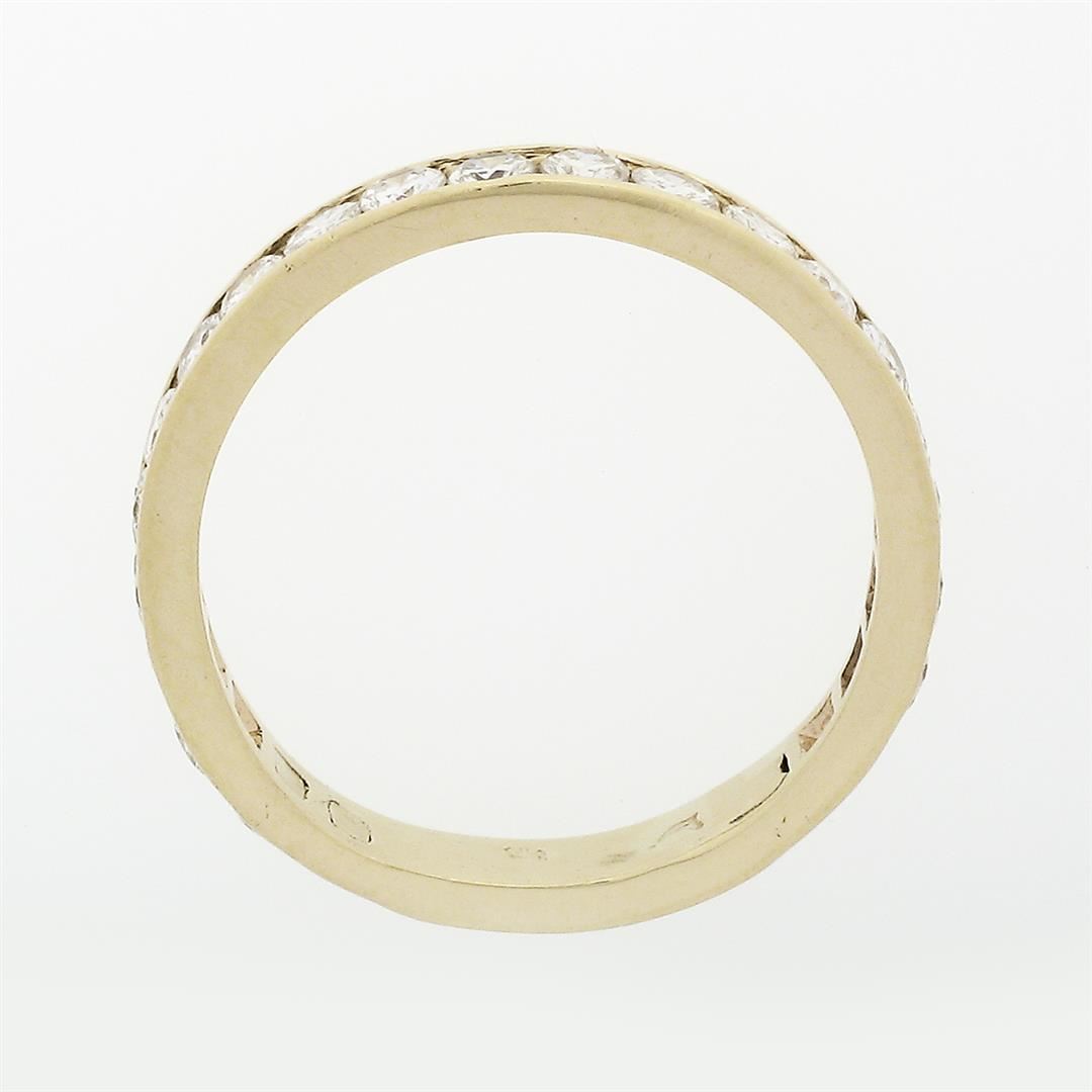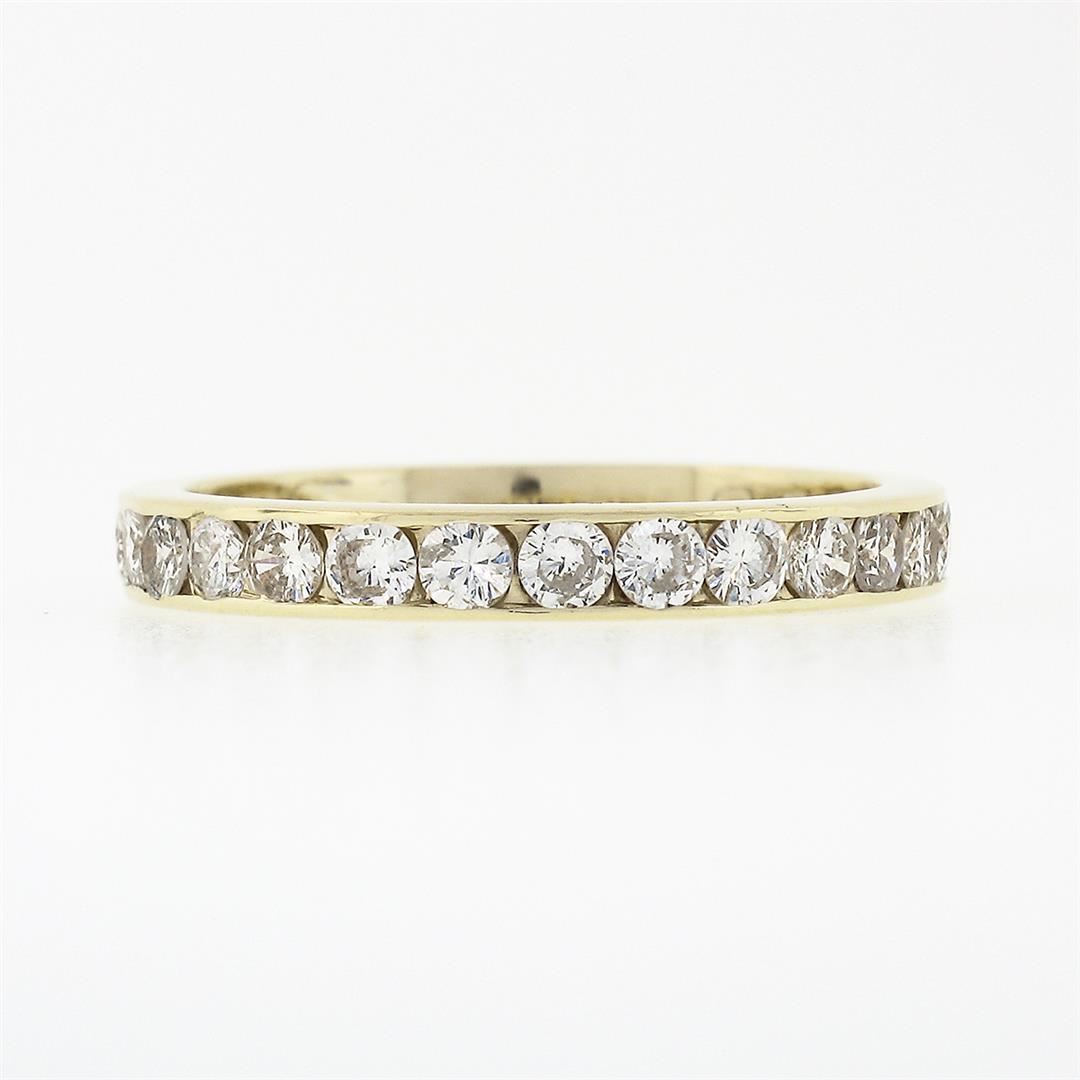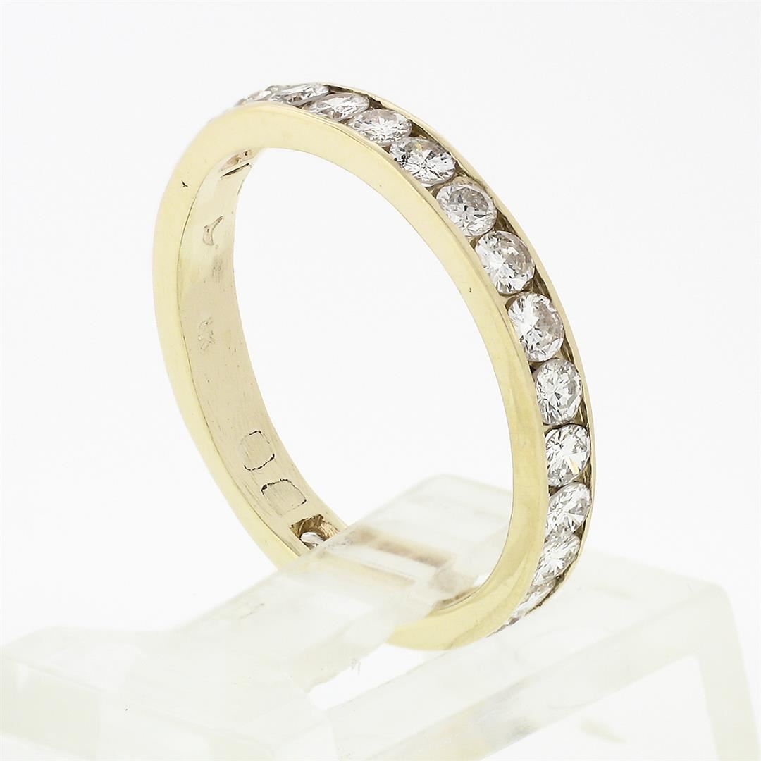 A solid 14k yellow gold wedding band ring, with 23 round brilliant cut natural diamonds (G/H - VS2/SI1 ; 1ctw). The ring is size 7.0, weighs a total of 2.15 grams, and measures 2.8mm wide.