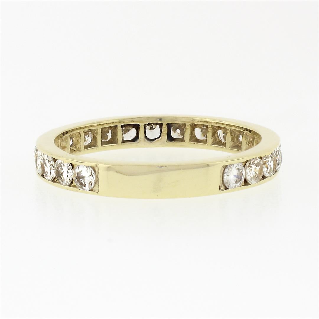 A solid 14k yellow gold wedding band ring, with 23 round brilliant cut natural diamonds (G/H - VS2/SI1 ; 1ctw). The ring is size 7.0, weighs a total of 2.15 grams, and measures 2.8mm wide.