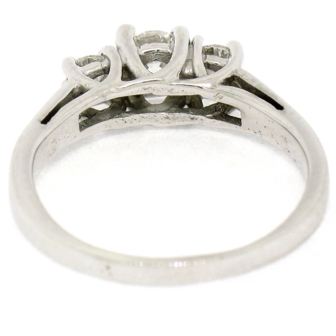 An estate solid 14k white gold three stones engagement ring, featuring 1 round brilliant cut natural diamonds (F/G- VS2 ; 0.25ct), and 2 round brilliant cut natural diamonds (F/G - VS2 ; 0.20ctw ). The ring is size 6.0, weighs a total of 3.1 grams, and measures 4.50mm wide.